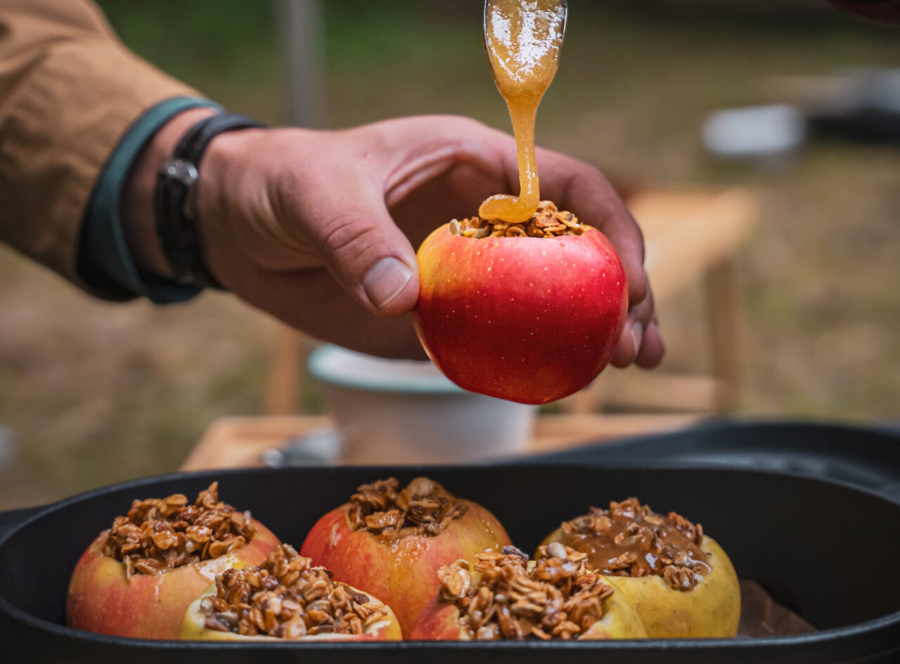 Bakade granola-äpplen i fältugnen